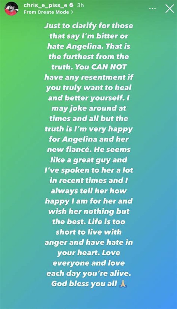 However, Chris deleted his Instagram after allegations of him cheating on Angelina with model and activist Jazlyn Rose were published.Is Angelina and Chris still together?