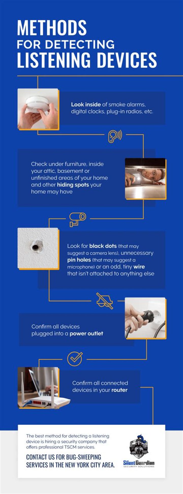 Another simple yet often effective method of telling if your house is bugged is to turn off any wired or wireless electronics you know of in the room. And then, stand still and listen carefully for any out-of-place noises that a remote device may be emitting.How do you destroy a listening device?