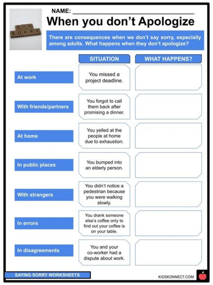 Basically, if you care about the other person and the relationship, and you can avoid offending behavior in the future, an apology is usually a good idea. This doesn't mean that you need to take responsibility for things that were not your fault.What are the 3 parts of an apology?