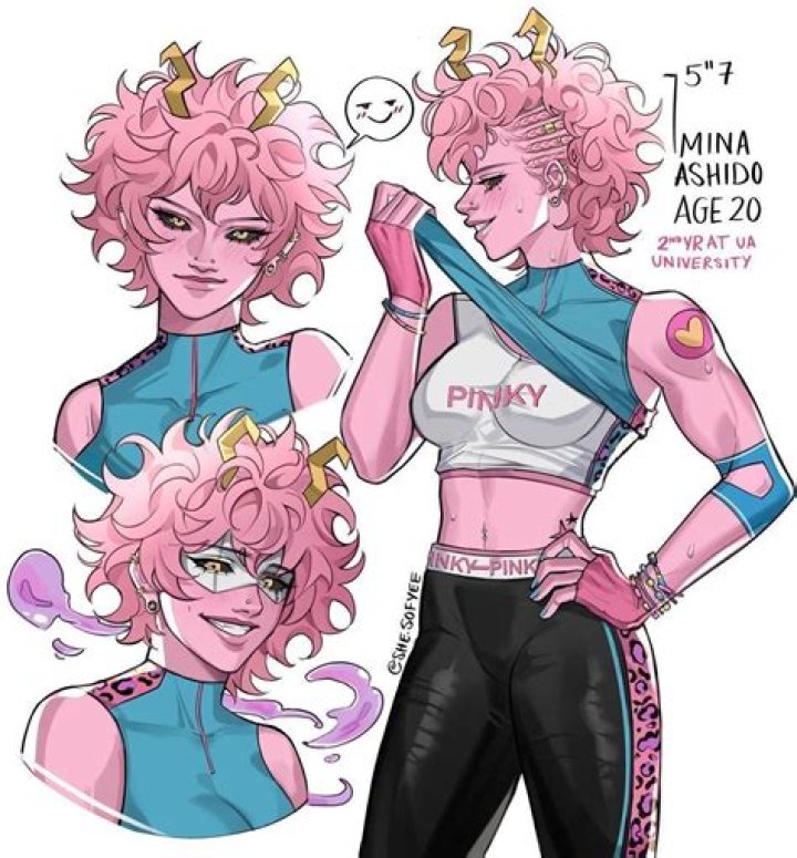 Due to her Quirk, her skin is a light shade of pink, and she has somewhat square shaped eyes with black sclera and yellow irises and notably long eyelashes below and around the sides of her eyes.The Life Of Mina Ashido: Pinky (My Hero Academia)