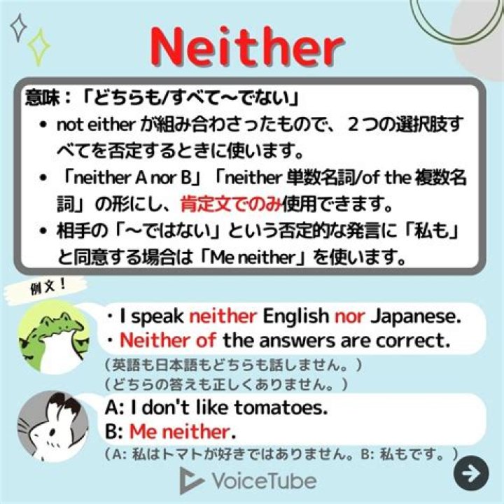 If someone makes a positive statement and you want to agree with it, the grammatical way to reply is "me too." Both "me neither" and "me either" are often used to agree with a negative statement, but "me either" is often considered ungrammatical.What is another word for neither?