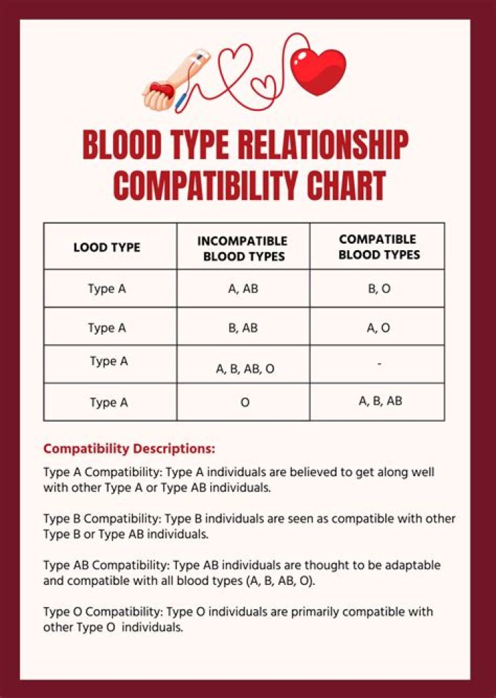 Based on these traits, the theory suggests these blood type matches are most likely to result in happy marriage: O Male × A Female. A Male × A Female. O Male × B Female.Which blood type is most compatible?