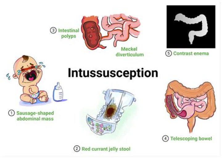 Other frequent signs and symptoms of intussusception include: Stool mixed with blood and mucus — sometimes referred to as currant jelly stool because of its appearance. Vomiting. A lump in the abdomen.How do I know if my baby has intussusception?