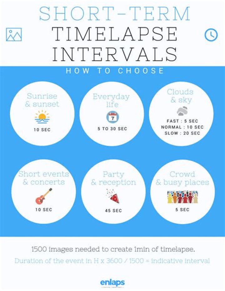 If you want a time-lapse video that runs at 30fps with a duration of 30 seconds, setting a shooting interval of eight seconds will give you an event duration of 2 hours.TIME LAPSE Intervals EXPLAINED! (Time Lapse Tutorial)