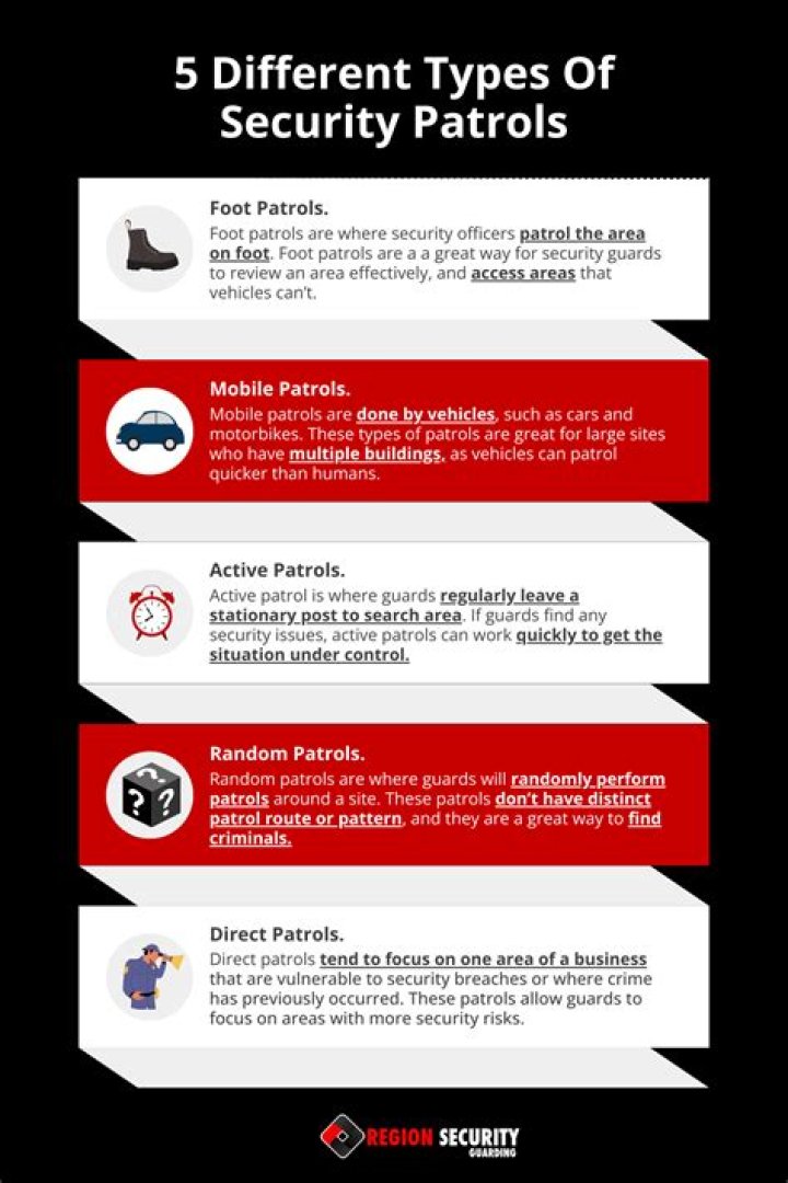 Of the many different types of patrols; here is a list of the main ones: Foot patrols; perhaps the most effective as the police officers are able to interact directly with the local population.