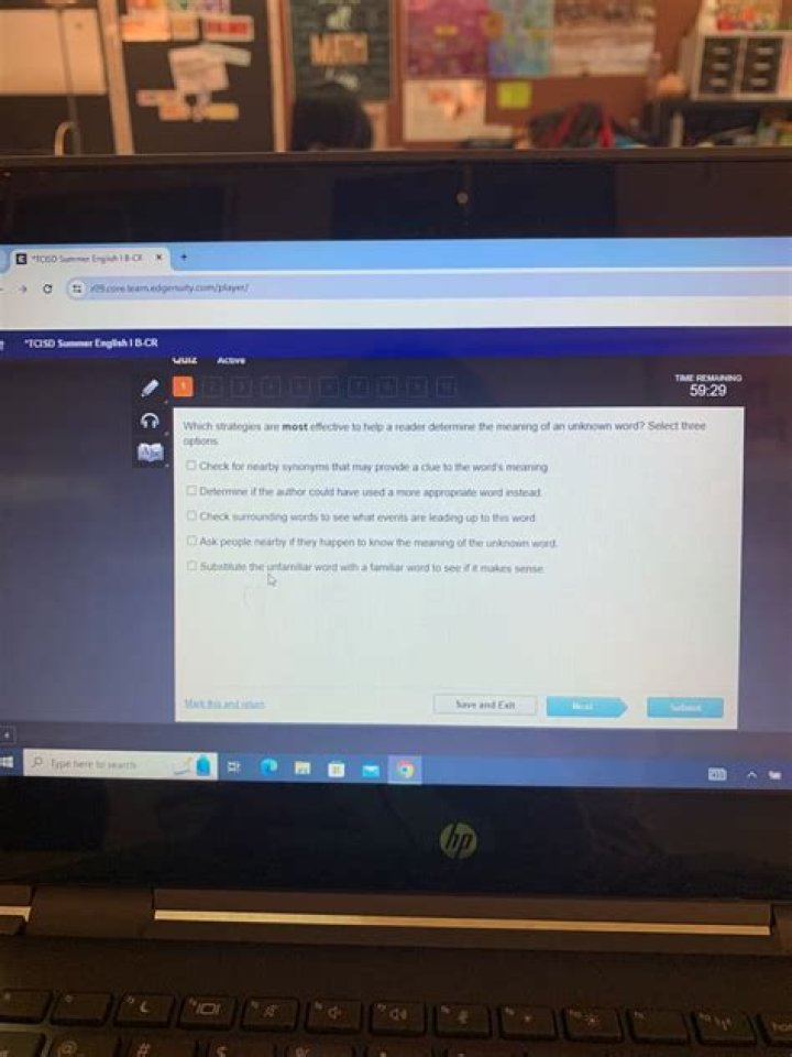 Select three options. Check for nearby synonyms that may provide a clue to the word's meaning. Check surrounding words to see what events are leading up to this word. Substitute the unfamiliar word with a familiar word to see if it makes sense.